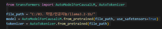 자 그럼 python 코드를 작성해 보겠습니다. 우선 타깃 경로에 hugging face에서 다운로드한 파일(mode.safetensors, config.json, tokenizer.json 등)을 넣어둡니다.