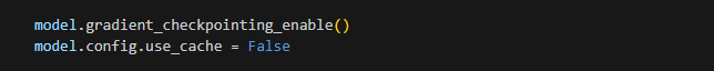gradient_checkpointing_enable()은 메모리 사용량을 줄이기 위해서 중간중간 데이터를 저장하지 않고 필요할 때만 재계산을 수행하도록 해주는 메서드입니다. 또, use_cache를 비활성화해서 학습 중 계산된 결과를 개시하지 않도록 하여 메모리 사용량을 줄이도록 합니다.