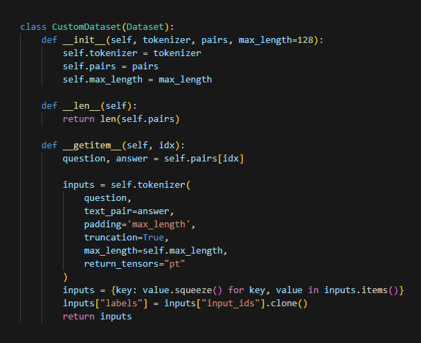 우선, 이전 글에서 다운로드해 둔 한글 데이터셋 중에서 질문-답변 쌍으로 구성된 SFTlabel.json 파일들을 로드에 둡니다. 그런 후 이들을 토크나이저로 변화하여 커스텀 데이터셋을 생성하기 위해 파이토치 패키지에서 제공하는 Dataset 클랙스를 상속해야 합니다.