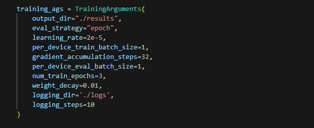 TraininArguments 클래스를 통해 학습 방법, 리소스 사용 설정 그리고 결과 저장 위치를 설정합니다. 아래 코드와 같이 말이죠.
