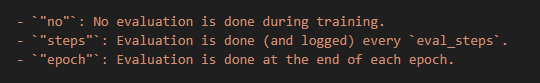 학습 설정 관련은 eval_strategy, learning_rate, num_train_epochs, weight_decay부분입니다. 예를 들어 위 코드에서 eval_strategy=”epoch”로 설정했는데, 이것은 학습 데이터 전체를 한번 학습한 후에 평가를 실행하다는 의미입니다. eval_strategy를 통해 가능한 설정 값은 아래와 같이 3 종류입니다.